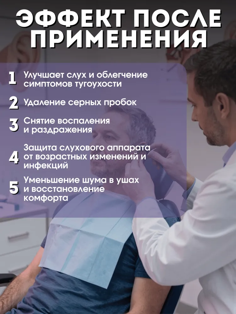 Средство оказывает выраженное профилактическое действие. Регулярное применение способствует защите клеток внутреннего уха от возрастных изменений и окислительного стресса, поддерживает их нормальное функционирование и снижает риск прогрессирования слуховых нарушений.