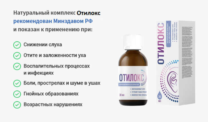 Отилокс — натуральный комплекс для быстрого облегчения состояния ушей, который помогает снять боль, шум и заложенность без химии и побочек. Он мягко уменьшает воспаление, растворяет серные пробки, очищает слуховой проход и восстанавливает комфорт даже при хронических проблемах или возрастных изменениях слуха. Средство глубоко воздействует на причины дискомфорта: снимает отёк и воспаление в среднем ухе, улучшает кровоток в ушной раковине, растворяет серу и устраняет зуд. Благодаря только природным компонентам Отилокс бережно заботится о здоровье ушей и позволяет забыть о боли, шуме в ушах, заложенности, снижении слуха и дискомфорте при простудах или перепадах давления.
